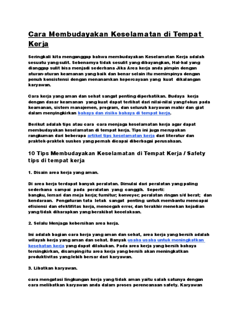 Selain untuk menjamin keberlanjutan perusahaan dalam menjalankan bisnisnya, penerapan prosedur keselamatan kerja di tempat kerja. Keselamatan dan kesehatan kerja di tempat kerja 3. mematuhi peranti keselamatan pada mesin yang sesuai. Kecuaian boleh membahayakan diri dan orang lain serta menyebabkan kerosakan kepada peralatan. 10 tios membudayakan keselamatan di tempat kerja/safety panduan dalam tempat kerja.