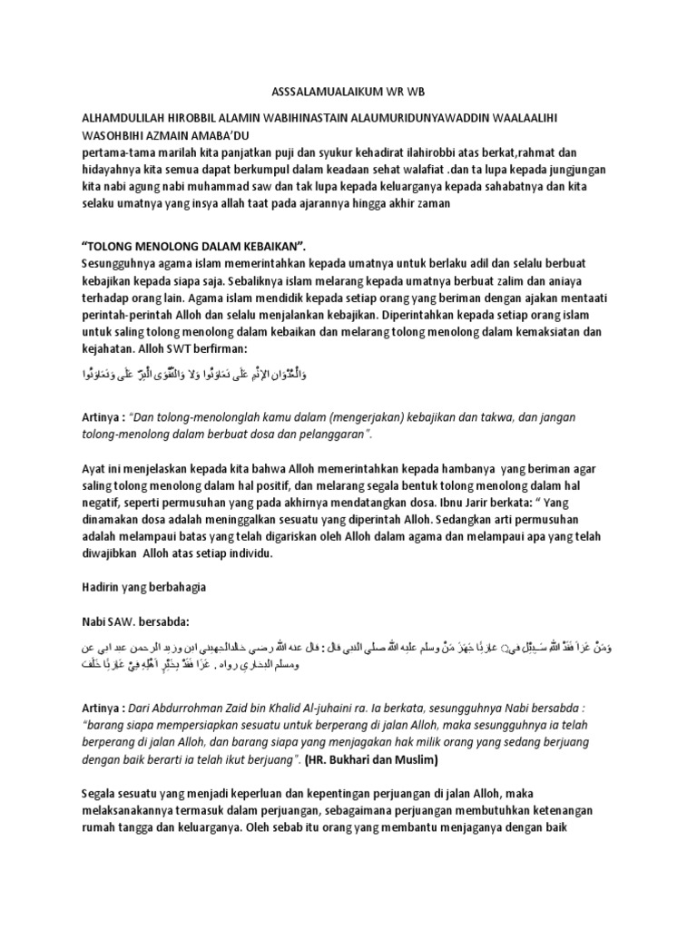 Tolong Menolong Dalam Islam from imgv2-2-f.scribdassets.com Sikap saling peduli dan tolong menolong menjadi salah satu ciri khas dalam budaya islam. "dan tolong menolonglah kamu dalam (mengerjakan) kebajikan dan takwa, dan jangan tolong menolong dalam berbuat dosa dan pelanggaran". Tidak ada arti dan nilainya jika kita menganggap saudara tetapi kita tidak membantu saudara kita ketika memerlukan bantuan, dan menolongnya ketika dia ditimpa cobaan, serta belas kasihan ketika ia dalam keadaan lemah. Dalam ajaran islam, perintah tolong menolong diarahkan dalam konteks yang positif, yakni dalam urusan kebaikan dan ketakwaan. Selama tolong menolong tersebut dalam kebaikan, maka allah akan memberikan ganjaran yang pantas di akhirat kelak. Hal ini lantaran allah secara langsung mengamanatkannya dalam dalil alquran kepada seluruh umat manusia. Sejarah telah membuktikan bagaimana sebuah masyarakat madani di madinah terbentuk berkat ukhuwah (rasa persaudaraan) serta saling tolong menolong dalam kebaikan dan ketakwaan yang terjalin antara kelompok muhajirin dan anshar. Dalam ajaran islam, perintah tolong menolong diarahkan dalam konteks yang positif, yakni dalam urusan kebaikan dan ketakwaan.